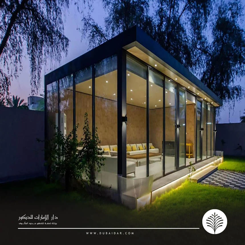 هذا النوع يستخدم كمساحة ضيافة مستقلة داخل الحوش بتصميم زجاجي فاخر. بالإضافة إلى ذلك، يوفر خصوصية عالية مع مظهر عصري أنيق يجذب الانتباه، وتتميز بالتالي:
